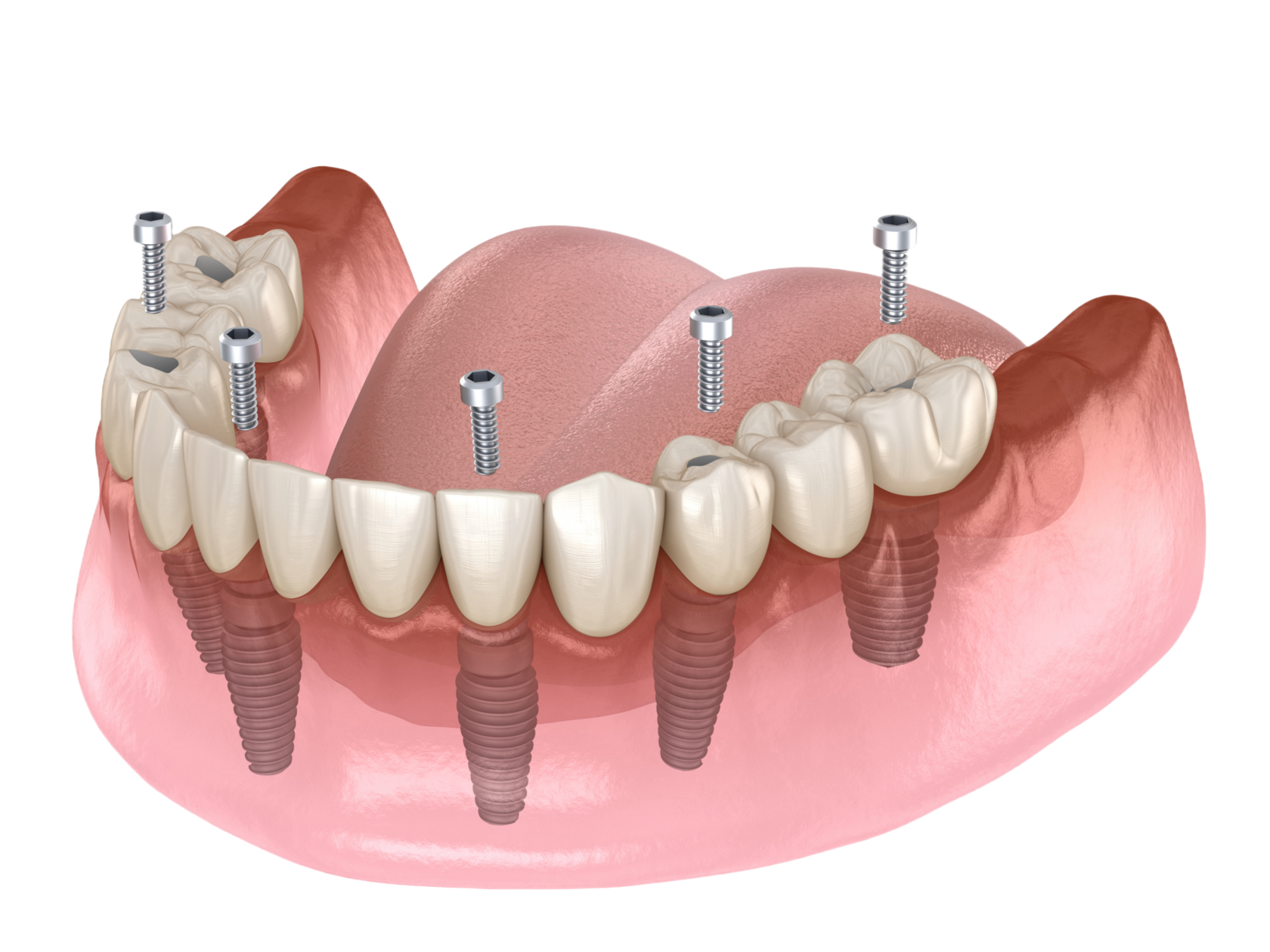 Установка фиксированного моста осуществляется на 4-6 имплантатах (зависит от того- верхняя или нижняя челюсть).
